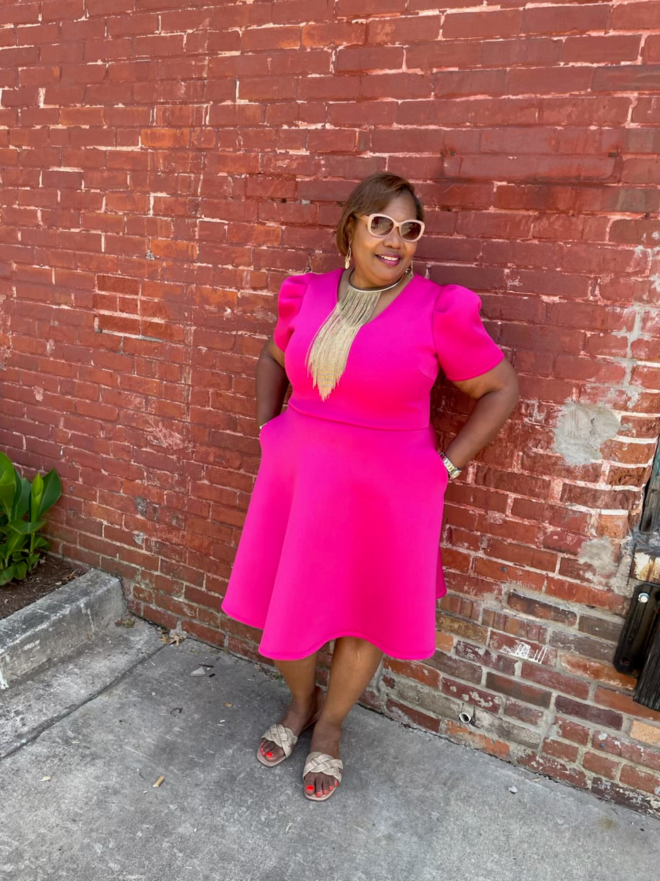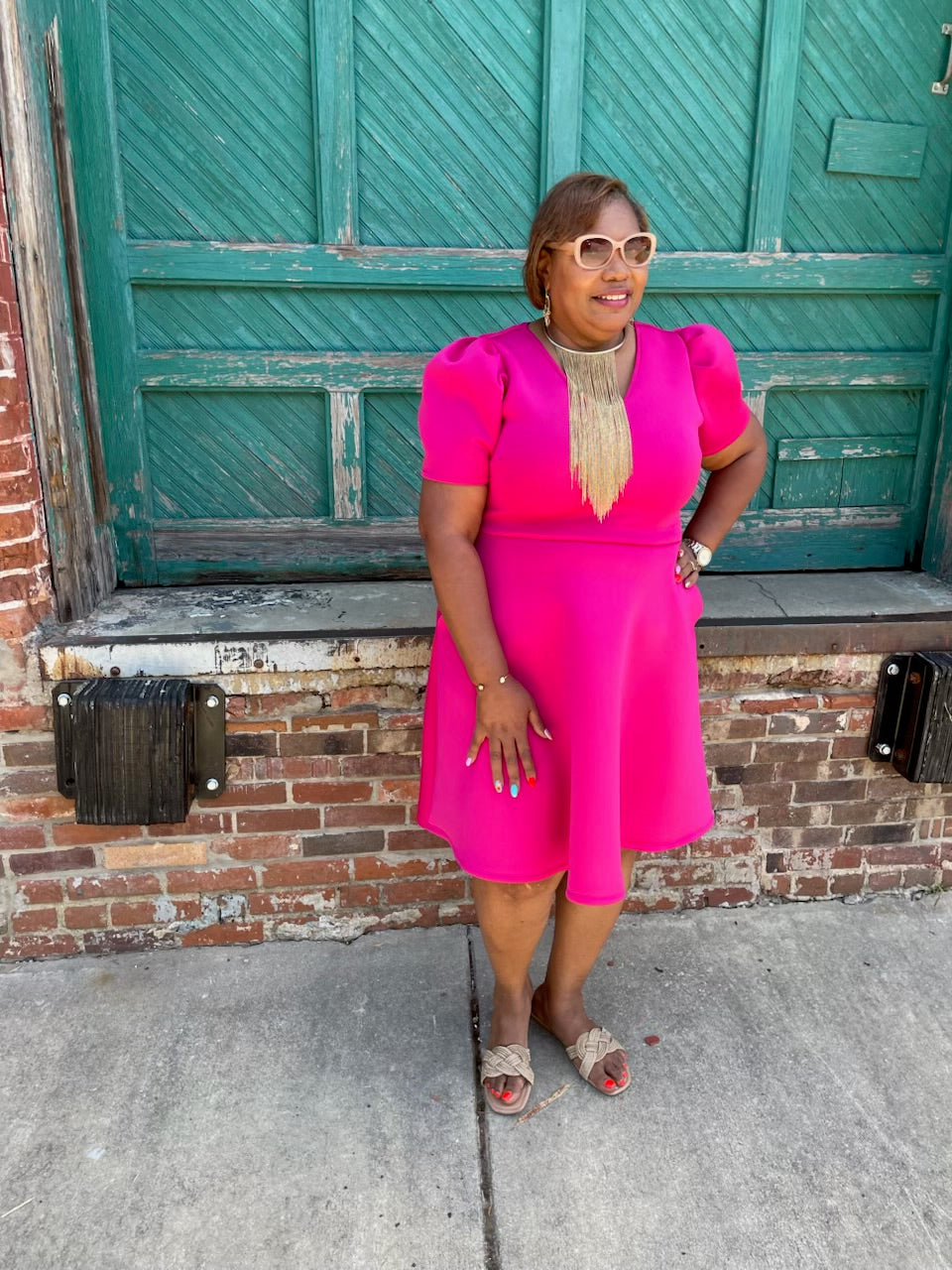 This hot pink scuba dress hugs in all the right places and flares just where you want it to. With puff sleeves that say “I’ve arrived” and a silky-smooth stretch that keeps you comfy while looking luxe, she’s perfect for brunch dates, bold entrances, and Bella Queen confidence.