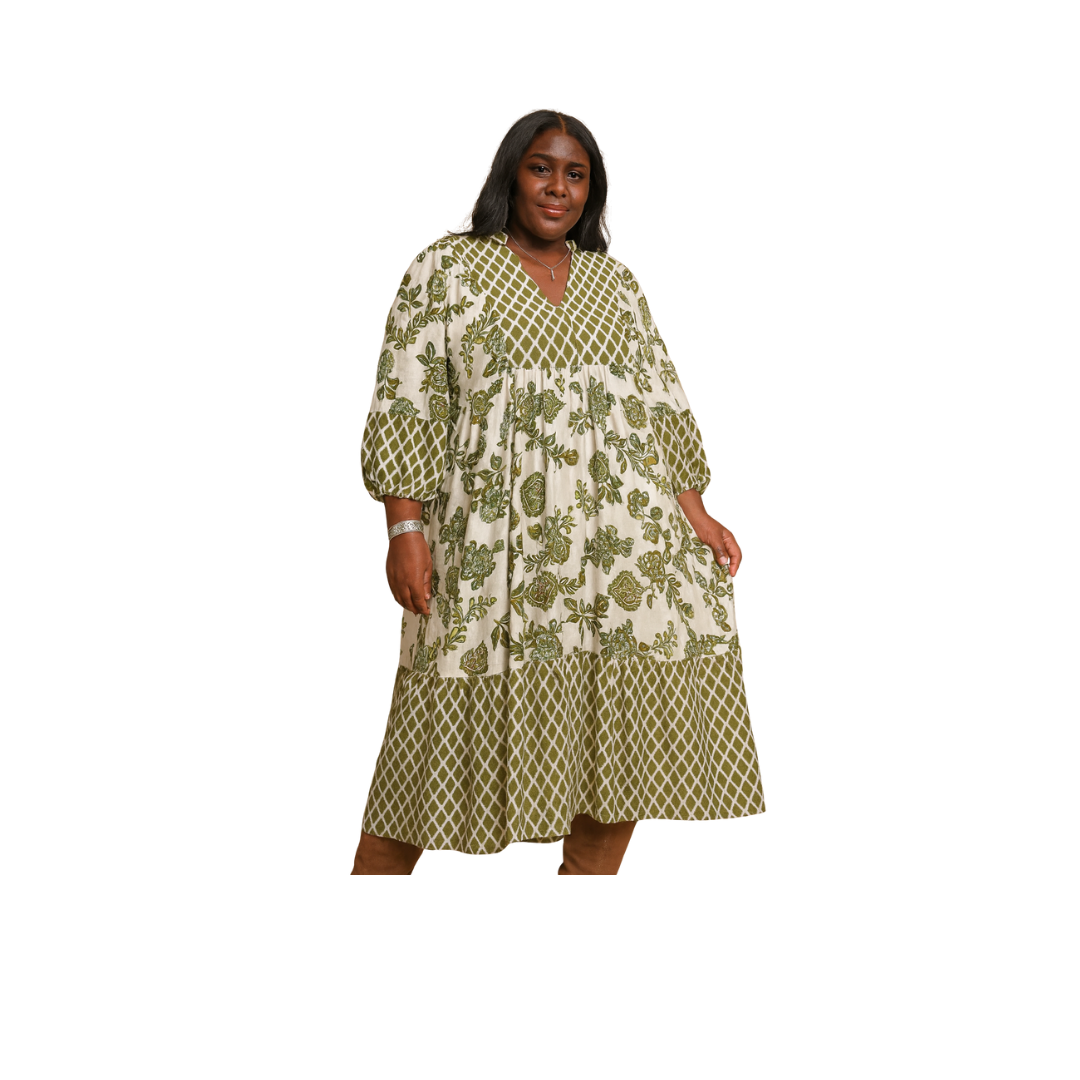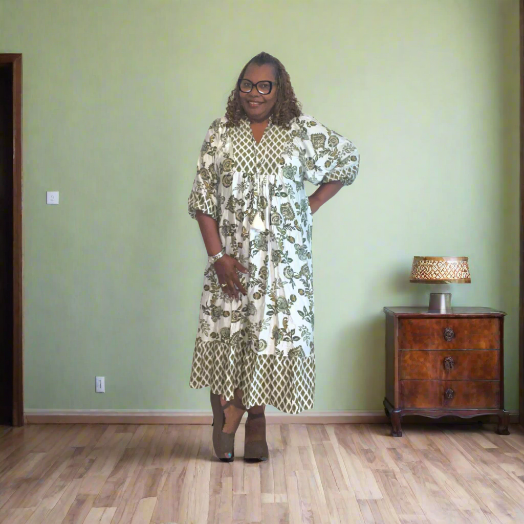 Olive you, Bella Queen. 💚 This boho-chic beauty mixes earthy greens with bold florals and a geometric diamond print for a look that’s equal parts free spirit and polished perfection. The flowy tiered skirt, billowy ¾ sleeves, and flattering V-neckline give you that “effortlessly fabulous” vibe—whether you’re strolling the market, brunching al fresco, or making an entrance just because you can.