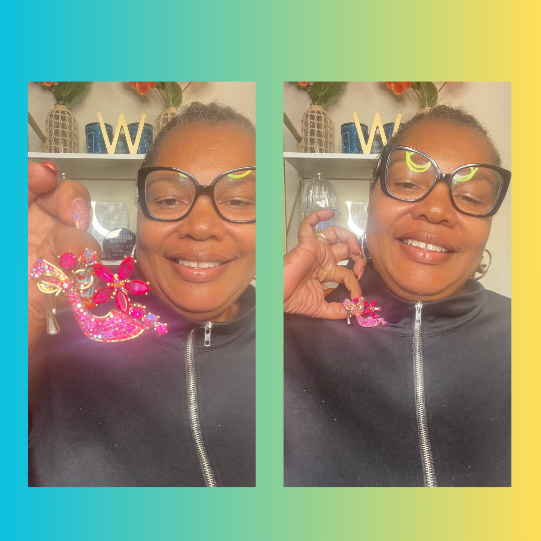 Make every outfit a runway moment with this rhinestone high-heel brooch. Drenched in hot pink sparkle and accented with a bold floral detail, this piece screams unapologetic glam. Pin it on and let your accessories strut as loudly as your confidence.