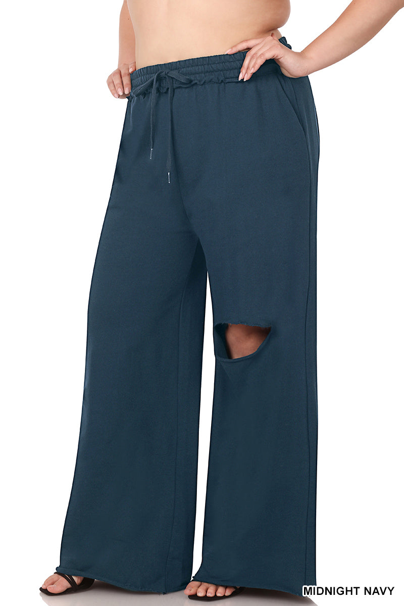 Plus Size French Terry Laser Cut Pants with pockets, featuring a comfortable elastic drawstring waist, raw edge hem, and stylish knee cut-out detail. Perfect for a chic, casual look!"