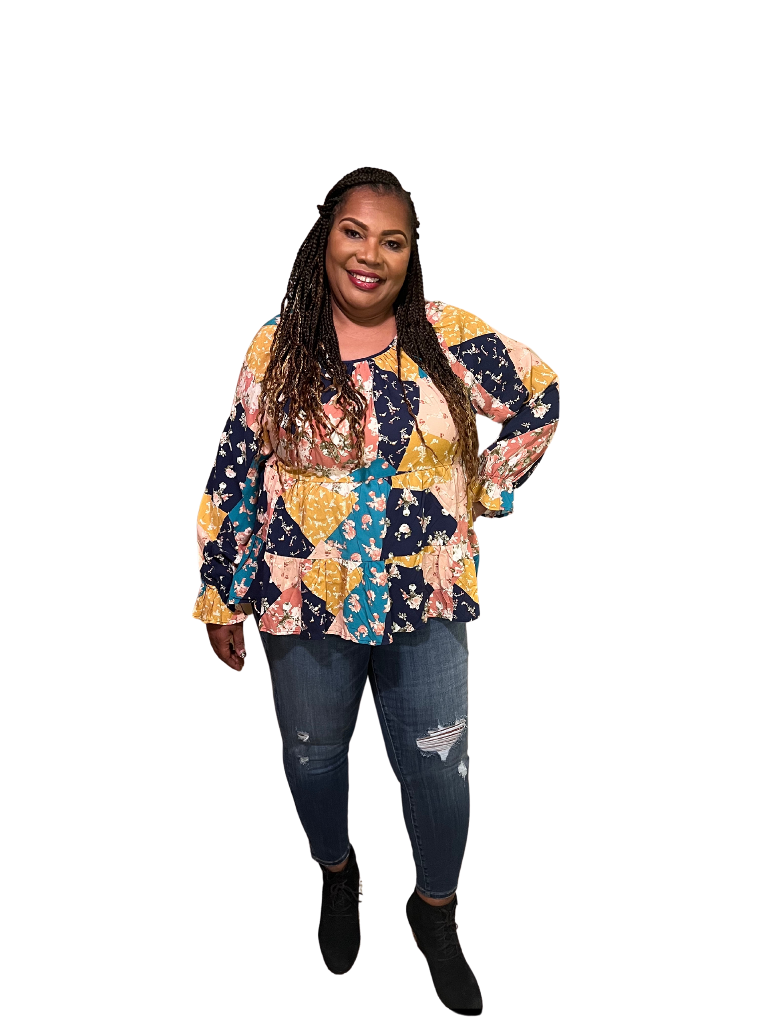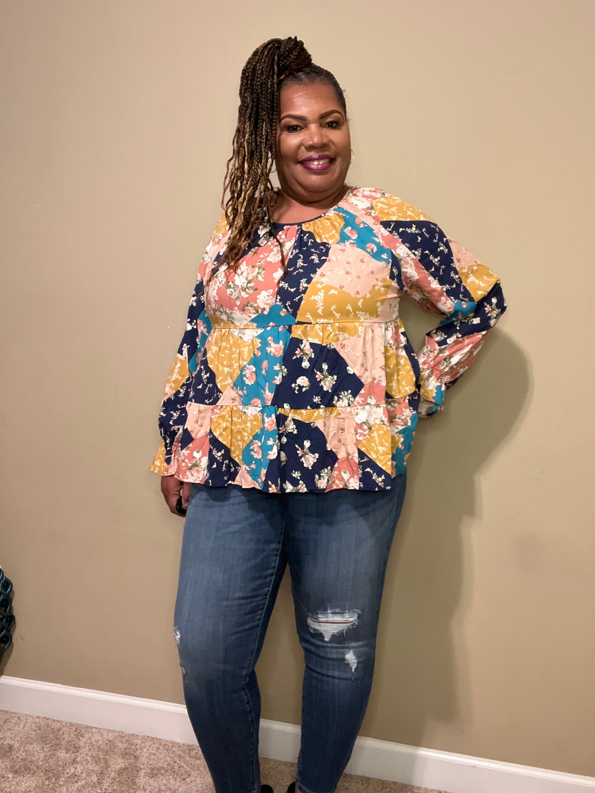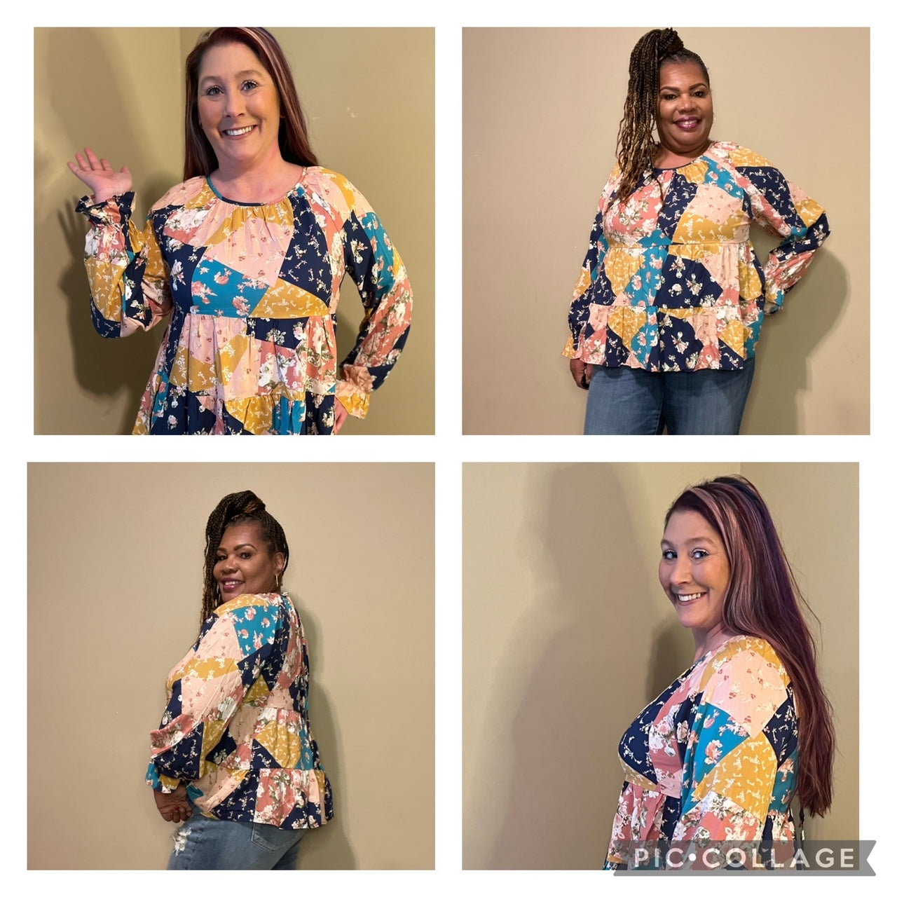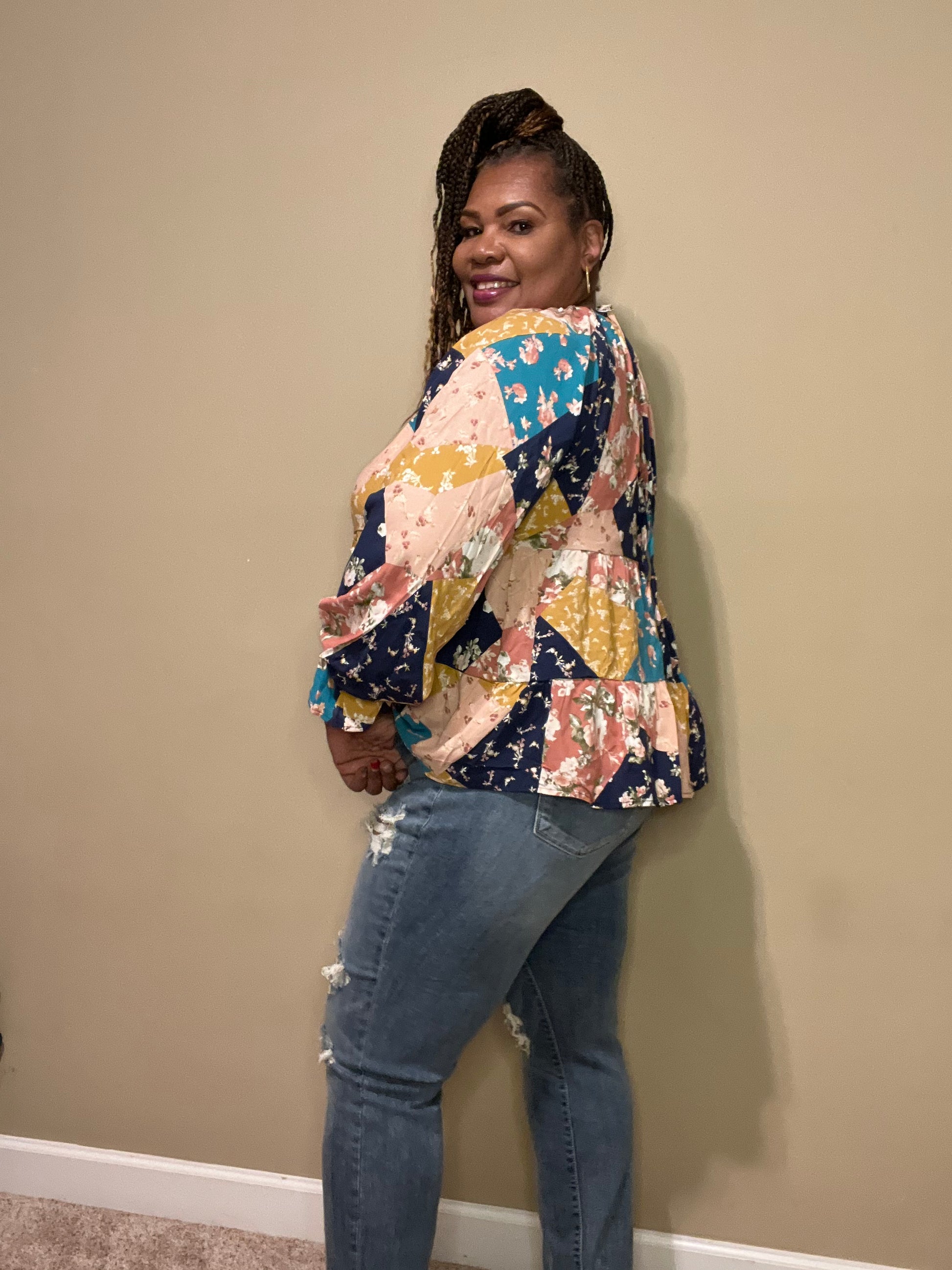 Lightweight Tiered  blouse with patchwork print, round neckline and billow elastic sleeves and ties in the back. Pairs well with our Judy Blue Jeggings or Judy Blue Destroyed Boyfriend Jeans. Models are wearing a Medium and 1X