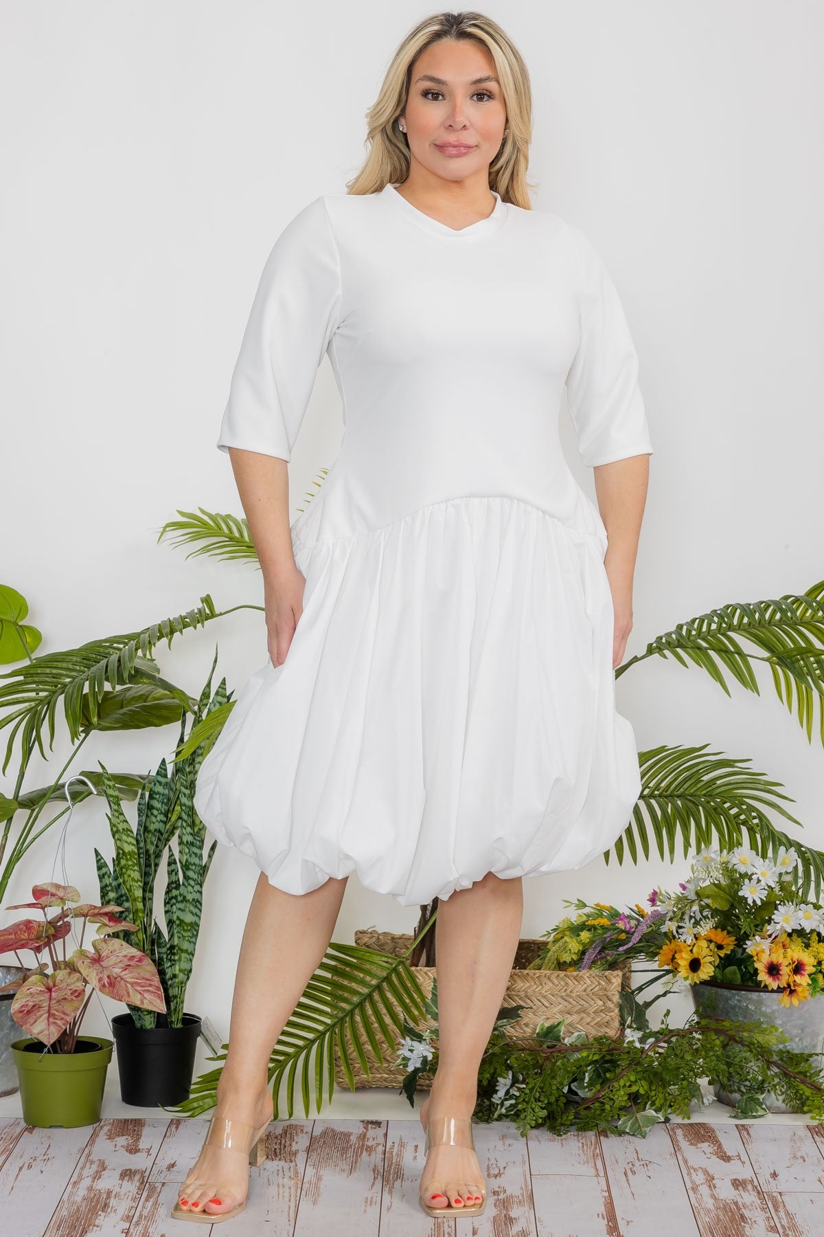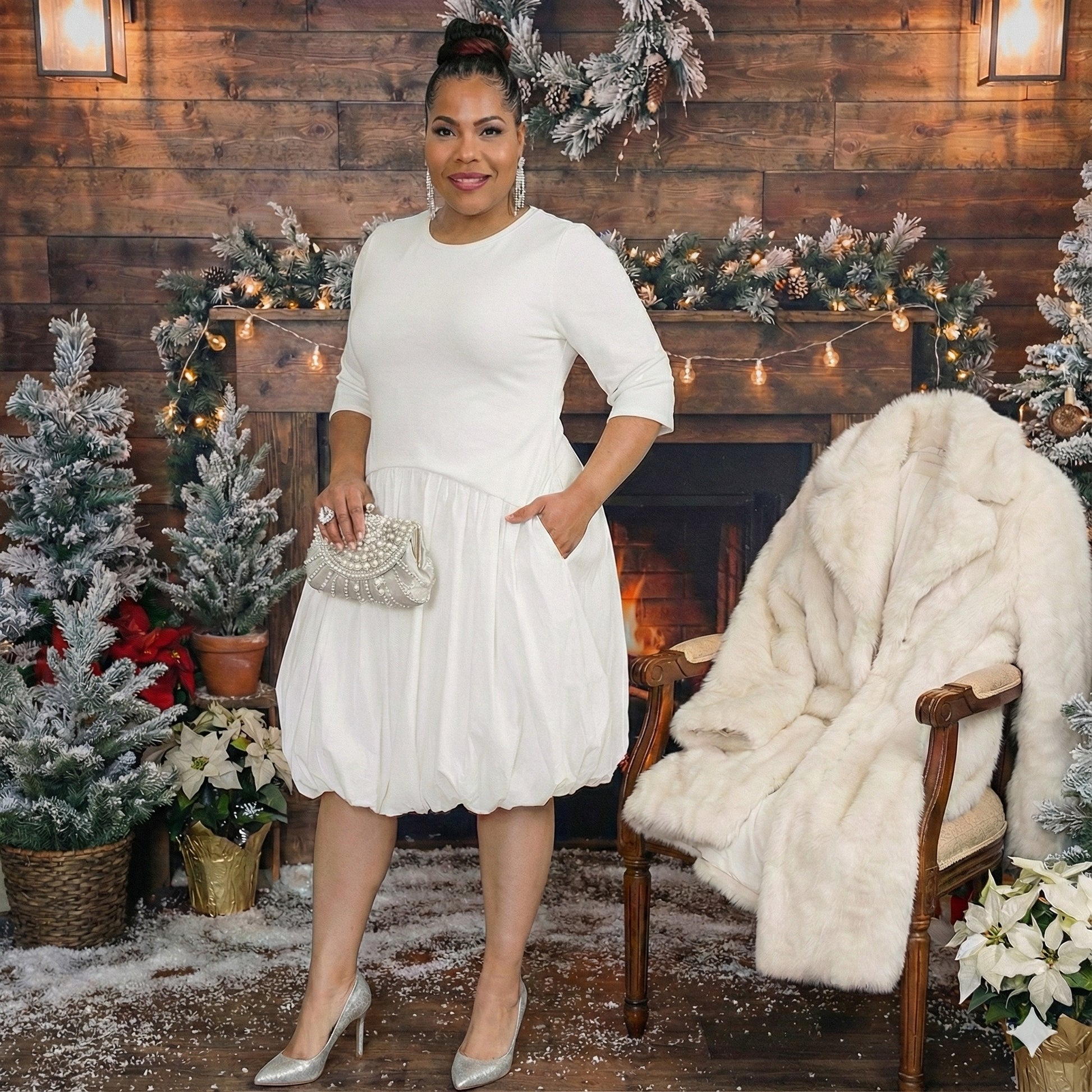 This stunning balloon dress combines soft structure with standout detail. Designed with a rounded neckline, 3/4 sleeves, and a voluminous bubble-style hem, it’s the perfect mix of modern sophistication and feminine flair.